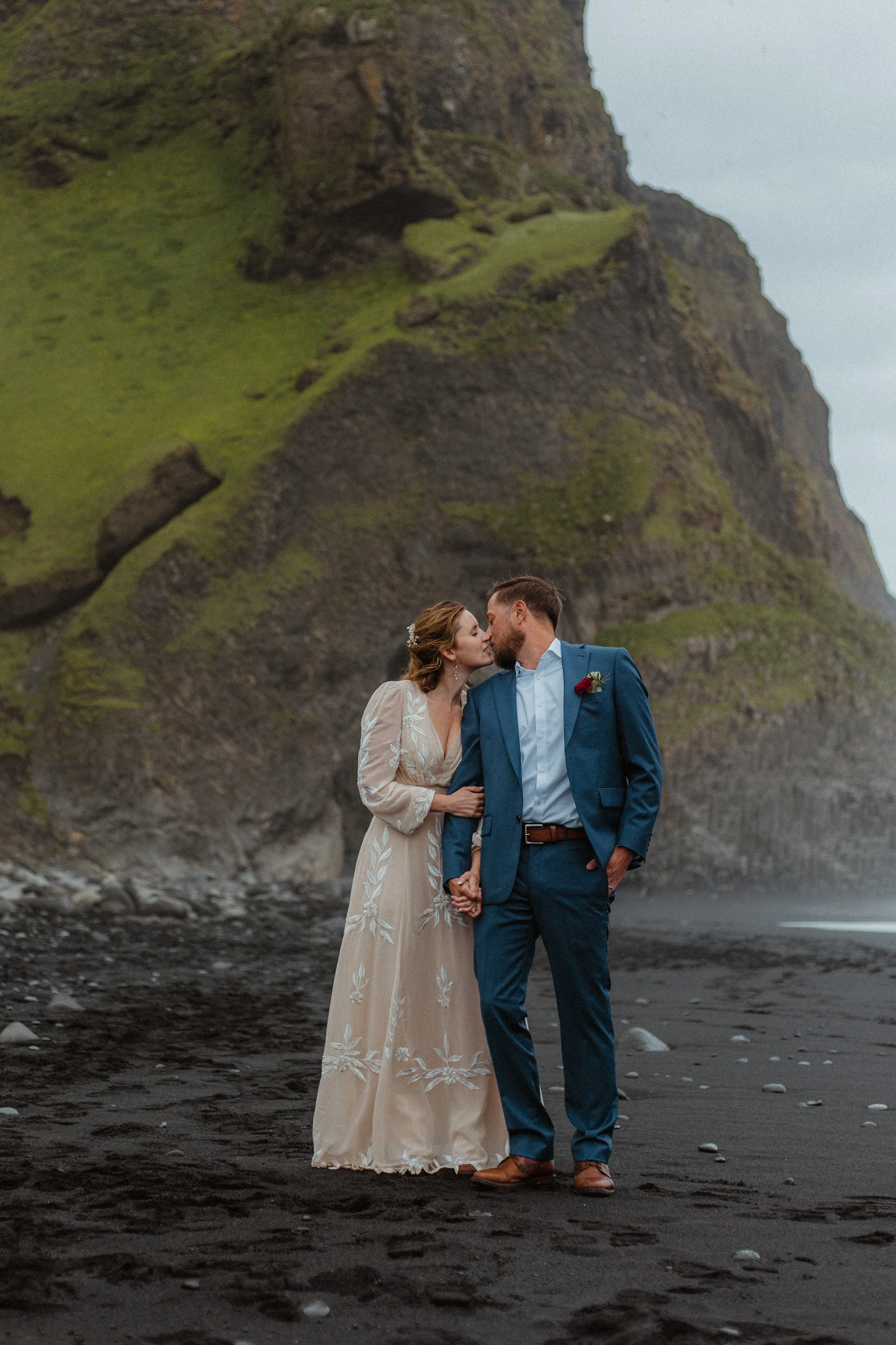 This elopement took place on the 1st July, 2024 on the South coast of Iceland. It was a perfect summer afternoon and we started our adventure at the majestic Kvernusfoss waterfall. This waterfall is perfect for elopement shoots as it feels more intimate and less crowded than its neighbour Skógafoss. One of the most unique viewpoints there is standing directly behind the waterfall and the best part is that you don’t get wet there! The area around Kvernufoss is as stunning as the waterfall itself, it’s lush green hills with birds flying around..looks like a movie scene.
